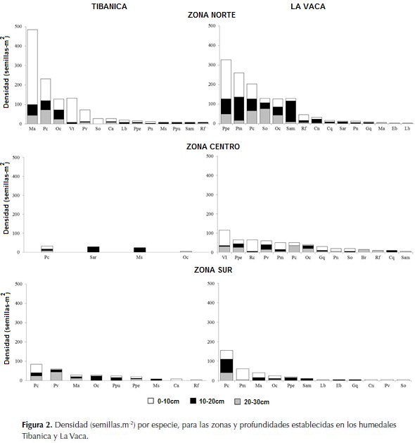 En el humedal Tibanica la densidad difiere significativamente entre las zonas (F = 9.269, gl = 2, p = 0.001), entre profundidad (F = 3.878, gl = 2, p = 0.03) y en la interacción zonas por profundidad (F = 3.269, gl = 4, p = 0.022). Estas diferencias fueron significativas entre la zona norte y las zonas centro (p = 0.001) y sur (p = 0.008), y entre la profundidad 0-10 cm y 20-30 cm (p = 0.036). La zona norte registró la mayor densidad promedio (1184 ± 704 semillas.m-2) respecto a las zonas centro (88 ± 108 semillas.m-2) y sur (264 ± 248 semillas.m-2). Con respecto a la profundidad, la densidad promedio fue mayor hasta los 10 cm (304 ± 489 semillas.m-2) y menor a una profundidad de 20 a 30 cm (88 ± 103 semillas.m-2).