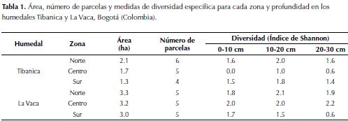 Con respecto a la diversidad en los dos humedales, no se observa una tendencia a aumentar o disminuir con respecto a la profundidad. En el humedal Tibanica la diversidad en las tres zonas es mayor a una profundidad de 10 a 20 cm, mientras que en el humedal La Vaca la diversidad varia diferencialmente entre zonas y profundidades (tabla 1). Sin embargo, estos valores no difieren estadísticamente (t = 2.067, gl = 16, p = 0.055).