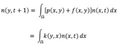 where k(y, x) represents all transition probabilities of an individual of size x at time t into an individual of size y at time t + 1, including new recruits. This function, called kernel, is integrated over a set of all size possibilities (Ω), and is made up of two components –a survival-growth function p(x, y), and a fecundity function f(x, y). The fecundity function f(x, y) is positive for large individuals at time t (parents, x) and small individuals at time t+1 (offspring, y), and it is zero for all others; the function p(x, y) incorporates growth and survival of all individuals (Easterling et al., 2000).