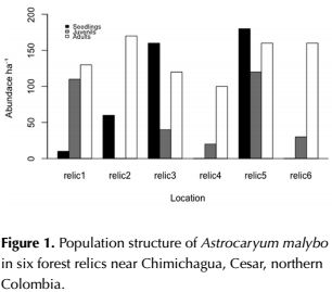 Population structure of A. malybo in the six forest fragments near Chimichagua showed very different trends. Two relics (4 and 6) did not have seedlings, and in two other (1 and 2) there were fewer seedlings than adults (figure 1); only in two relics (3 and 5) was the proportion of seedlings greater than that of adults; the latter relics have a continuous canopy cover (table 1). There were no juveniles in relic 2, and all other fragments their number was lower than that adults (figure 2). Overage density among all the relicts was 245 (S.D. = 135, n = 6); the highest density was found in relics 3 and 5, which had a continuous canopy cover, and harbored 320 and 460 palms/ha, respectively.