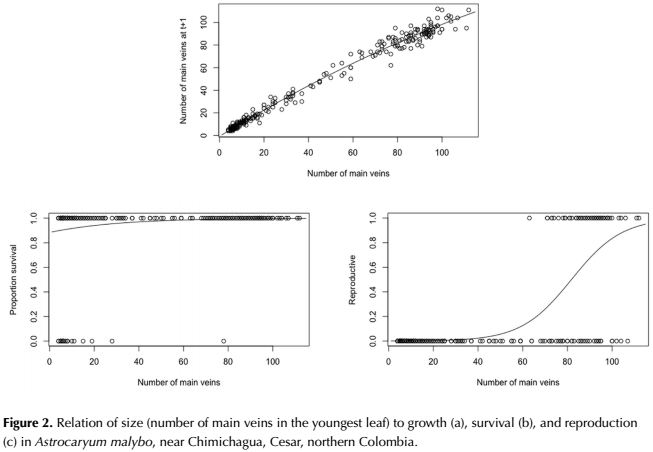 Size of A. malybo, as defined by the number of main veins in the youngest leaf, ranged between 4 veins in the first seedling leaf and 112 in adult palms. As shown in figure 2a, increase in the number of veins is constant during the juvenile stages; in adults, however, vein increase tends to be lower in older individuals. Similarly, survival of individuals is related to their size, with seedlings and young juveniles being less likely to survive than adults (figure 2b). Reproduction was also related to size, increasing as individuals grow (figure 2c). The first reproduction was observed in individuals with about 63 main veins.