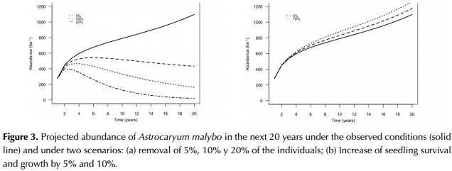 Transient dynamics simulations on the IPM show that the population of A. malybo would grow for the next 20 years, with a growth rate of 1.07084 (CI 1.07078-1.07090). Under the scenario of removing individuals of any size class, the population grows for the first two or three years, then remains steady, and finally decreases (figure 3a). When 5% of the individuals are removed (i.e. 17 individuals of any size per ha per year), population growth ceases for the next 20 years; when 10% or 20% of the individuals are removed, the population decreases, with a trend to disappearing within the 20 next years (figure 3a). On the other hand, our simulations show that any increase in seedling growth or survival would lead to population growth within the next 20 years (figure 3b).