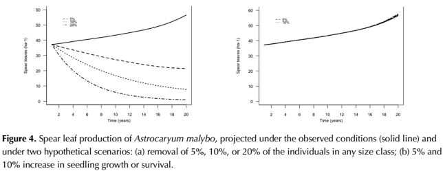 However, in the best-preserved plots with a continuous canopy, the population of A. malybo will grow at an annual rate of 7.1% over the next 20 years, providing up to 35 spear leaves/ha/year for handicraft production. Yet, any situation affecting the survival of individuals of any size can lead to a rapid decrease of population growth, bringing it to zero if 34 individuals of any size die per ha/yr. In contrast, any actions favoring seedling survival and growth would increase population growth rate, although the availability of spear leaves would not increase in the next 20 years, as individuals take a long time to be harvestable.
