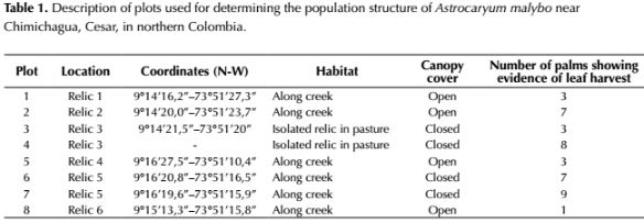 Our results show that natural regeneration of A. malybo near Chimichagua can be favored through management and protection of the forest remnants where it thrives. In this way, a supply of fiber for handicraft production can be maintained, while protecting this endangered species.
