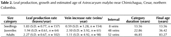 We studied population dynamics in a 1.5 ha forest remnant located on the banks of a creek in finca La Cabaña (9° 16' 19.6" N, 73° 51' 15.9" W), where we tagged and censused 361 individuals of A. malybo between July 2012 and July 2013 (195 seedlings, 64 juveniles and 102 adults). We selected this forest remnant because it harbored the largest population of the species in the region. Thirty-seven adult palms at this site had evidence of leaf harvest. We marked the youngest expanded leaf in each palm and counted the number of main veins on its right side; in the second census (July 2013), we measured annual leaf production. We then estimated age of the individuals by combining number of veins, annual leaf production rate, and average increase in vein number from one leaf to the next. We recorded the number and stage of reproductive structures in all adult palms.