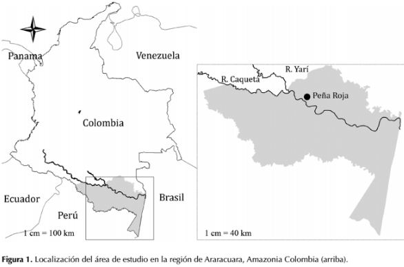 Se localiza en predios de la comunidad indígena de Peña Roja, en el resguardo Nonuya de Villa azul de la región de Araracuara, cuenca media del río Caquetá en la Amazonia colombiana (figura 1). La región del medio Caquetá hace parte de la denominada región noroccidental dentro de la gran cuenca del río Amazonas (Mitchard et al., 2014), y corresponde a un bosque húmedo tropical (bh-t) en el sistema de zonas de vida de Holdridge (1982), con temperatura promedio anual de 25.7 oC, precipitación promedio anual de 3059 mm y una distribución de las lluvias unimodal sin estación seca; la época de menor precipitación ocurre durante los meses de diciembre a febrero (Londoño, 2011).