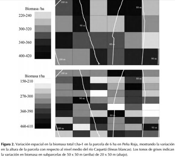 Se evaluó la variación espacial con base en parcelas de 0.25 ha (50 x 50 m), considerado el tamaño mínimo representativo para abarcar la variación local en la estructura de los bosques tropicales (Chave et al., 2004) y en parcelas de 20 x 50 m, que corresponde al tamaño usado más comúnmente para estimar la biomasa de los bosques de Amazonia colombiana (Phillips et al., 2011). Para evaluar el efecto de la topografía en cada cuadrante de 20 x 20 m se estimó la biomasa, la pendiente en % y la altitud promedio sobre el nivel del rio Caquetá. Posteriormente, se efectuó un análisis de regresión lineal para evaluar si la pendiente, la altitud o ambas explicaban la variación observada en la biomasa. Todos los cálculos se realizaron con Statgraphics XV.I. (Statgraphics Centurion, 2013)