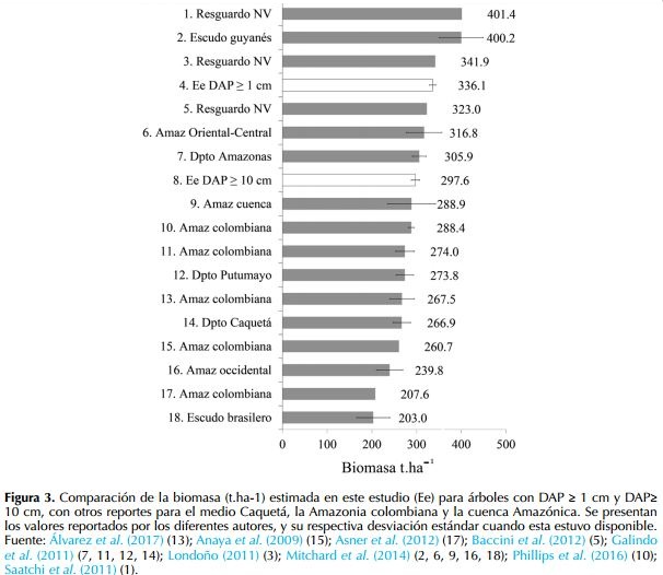 Phillips, J., Duque, A., Yepez, A., García, M., Navarrete, D. A., Álvarez, E. & Cárdenas, D. (2011). Estimación de las reservas actuales (2010) de carbono almacenadas en la biomasa aérea en bosques naturales de Colombia-Estratificación, alometría y métodos análiticos. Bogotá: Ideam.