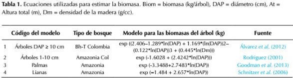 Para Colombia se cuentan con modelos nacionales de biomasa para las seis zonas de vida más representativas del país, los cuales son usados para estimar la biomasa de los bosques húmedos de la Amazonia (Álvarez et al., 2012; Phillips et al., 2016; Álvarez-Dávilaet al., 2017). Para los árboles con DAP ≥ 10 cm se eligió el modelo II.1 de Álvarez et al. (2012) que utiliza el DAP y la Dm, porque ha demostrado ser el más adecuado para la región. En el caso de los árboles del sotobosque utilizamos una ecuación no publicada (Rodríguez, 1991; Londoño, 2011) que fue construida con árboles pequeños entre 4-55 cm DAP en un sitio cercano a la parcela de 6 ha y en la misma unidad fisiográfica. Para las palmas de todos los tamaños a las que se pudiera medir de DAP (se excluyen las acaules) se utilizó el modelo de Goodman et al. (2013) para la familia y para lianas el de Schnitzer et al. (2006) (tabla 1). Para las ecuaciones que usan la densidad de la madera esta fue asignada a cada una de las especies, géneros o familias en la parcela a partir de la base de datos Dryad (Zanne et al., 2009), de acuerdo con Chave et al. (2014).