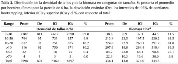De igual manera, considerando la heterogeneidad espacial de la biomasa dentro de la parcela de 6 ha se obtuvieron valores para los árboles con DAP ≥ 10 cm entre 37.15 a 40.48 Mt, para parcelas de 1 ha, y entre 36.27 a 41.36 Mt para las subparcelas de 0.1 ha. Este ejemplo muestra claramente que la variación espacial y el tamaño de la parcela determinan la incertidumbre de las estimaciones de la biomasa, similar que en otros estudios (Chave et al., 2004). Por tal razón, las estimaciones de biomasa requeridas por los esquemas dispuestos para incentivar económicamente la preservación del bosque en los programas REDD+ deben ser conservadoras.