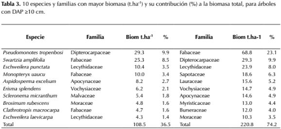 Las 10 especies de árboles más importantes en términos de biomasa representaron el 37.2 % del total (tabla 3). El árbol más abundante en nuestra parcela, Pseudomonotes tropenbosii, representó el 9.9 %. Las 20 especies con mayor biomasa para toda la amazonia pertenecen a 13 familias (Fauset et al., 2015), 8 de las cuales están entre las 10 con mayor biomasa en el bosque de tierra firme estudiado (Fabaceae, Lecythidaceae, Sapotaceae, Lauraceae, Vochysiaceae, Apocynaceae, Burseraceae y Moraceae; tabla 3).