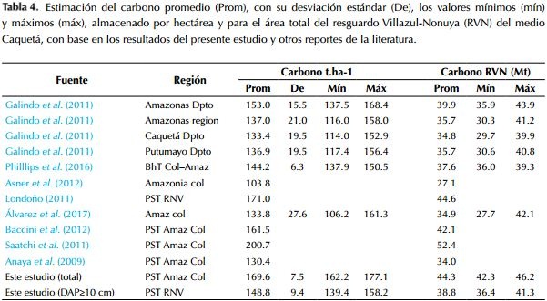 Se realizó una extrapolación para los bosques del resguardo Villazul-Nonuya con los diferentes reportes de la literatura para efectos de comparación. El carbono se estimó para todo el resguardo, pero esto tiene algunas restricciones pues además de los bosques de tierra firme sobre el Plano sedimentario terciario en el área existe otra variedad de tipos de bosque (inundables, arenas blancas, etc.), bosques sucesionales y áreas de cultivo (Duivenvoorden, 1995) en una extensión aproximada al 20% de su área, de acuerdo con información extraída a partir de un mapa digital del resguardo y el mapa de ecosistemas de Colombia (Ideam et al., 2007). Asumiendo esta restricción, para las 260 393 ha del resguardo se estimó un contenido de carbono entre 27.1 a 52.4 megatoneladas (Mt) calculadas con el promedio para la amazonia de Asner et al., (2012) y el valor para el sitio obtenido del mapa Pantropical de Saatchi et al., (2011) (tabla 4).