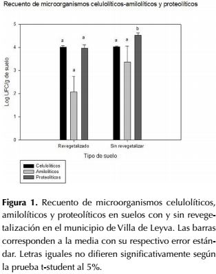 El recuento de microorganismos celulolíticos para la zona revegetalizada fue de 4.01 Log UFC.g-1 de suelo y en la zona sin revegetalización fue de 4.02 Log UFC.g-1 de suelo (figura 1). En este caso no se evidencian diferencias significativas en el recuento de este tipo de poblaciones (p>0.05), a pesar de que según el análisis fisicoquímico de los suelos los contenidos de materia orgánica difieren en las dos zonas analizadas, siendo superior para el suelo sin revegetalización. En este estudio el recuento de los microorganismos amilolíticos en la zona revegetalizada fue de 2.07 Log UFC.g-1 de suelo y en la zona sin revegetalizar fue de 2.36 Log UFC.g-1 de suelo (figura 1). Al igual que en las poblaciones celulolíticas, no se evidencia una diferencia significativa entre zonas (p>0.05). En el caso de los microorganismos proteolíticos el recuento fue de 3.97 Log UFC.g-1 de suelo para la zona revegetalizada y 4.52 Log UFC.g-1 en la zona sin revegetalizar (figura 1), en este caso sí se presentaron diferencias estadísticamente significativas entre las zonas en estudio (p≤0.05).