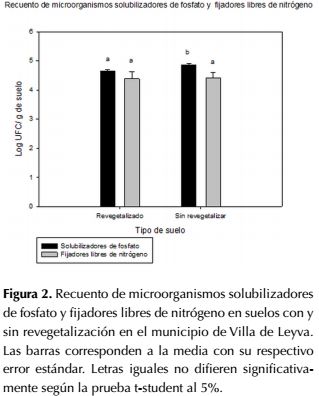 Con respecto a los microorganismos funcionales del ciclo de fósforo evaluados, se evidencian diferencias estadísticamente significativas para los dos sitios en estudio (p≤0.05), el recuento de microorganismos solubilizadores de fosfato para la zona revegetalizada fue de 4.63 Log UFC.g-1 de suelo y en la zona sin revegetalización fue de 4.85 Log UFC.g-1 de suelo (figura 2).