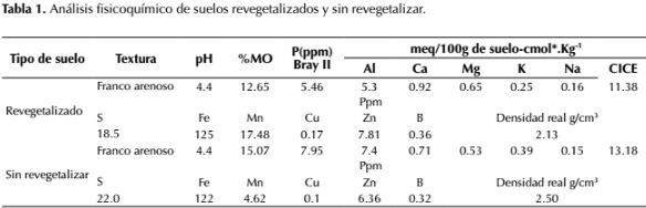 En el análisis fisicoquímico de los suelos evaluados se observa que tanto en los suelos revegetalizados como sin revegetalizar se presentan texturas franco arenosas y pH ácidos (tabla 1). La zona revegetalizada muestra CICE y contenidos de MO, P y K más bajos que los reportados en la zona sin revegetalización. Por su parte, los contenidos de Ca y S indican valores más altos en la zona sin revegetalizar, pero en cuanto a los demás elementos la zona revegetalizada muestra concentraciones mayores de Fe, Mn, Cu, Zn y B. Con relación a la densidad real, estadísticamente no hay diferencias entre los dos terrenos evaluados.