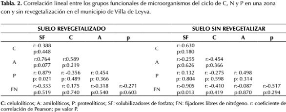 En la zona revegetalizada se encontró una correlación positiva entre bacterias proteolíticas y las solubilizadoras de fosfato, lo que podría indicar que los grupos bacterianos están actuando sinérgicamente posibilitando mecanismos de cometabolismo (Atlas & Bartha, 2002). Esta correlación ya ha sido encontrada en el estudio realizado por Torres & Lizarazo (2006), quienes evaluaron diferentes grupos funcionales en suelo rizosférico y suelo total de cultivos de cebolla y papa. El resto de correlaciones entre grupos funcionales no fueron estadísticamente significativas (tabla 2).