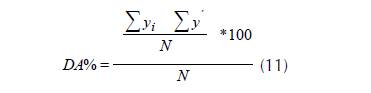 La evaluación de la capacidad predictiva de los modelos se realizó mediante el sesgo promedio (E) individual por estimación (10) y la diferencia agregada en porciento (DA %) para toda la muestra empleada (11) (Gilabert & Paci, 2010).