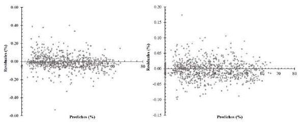 La prueba de SW en los modelos señala que la frecuencia de los residuales estudentizados es normal (SW > 0.93, α= 0.05). Para el caso de la distribución de residuales fue homocedástica en los dos modelos (figura 1).