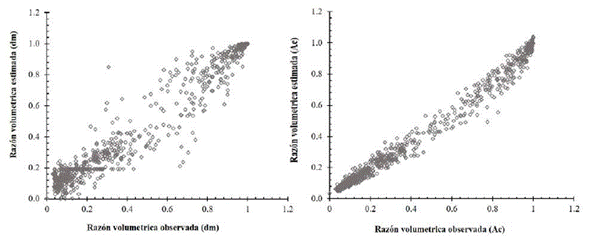 El sesgo individual es de -0.0121 y 0.0053 para los mejores modelos de razón volumétrica 3 y 7, respectivamente; mientras que la DA es menor a 1 % (-0.0175 y -0.0017). Al graficar la razón volumétrica de los datos observados frente a los valores predichos, la tendencia se asemeja a una línea recta que indica la adecuada estimación de las ecuaciones obtenidas (figura 2).