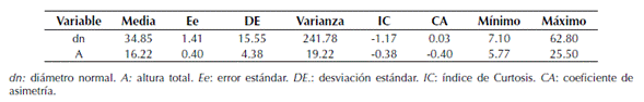 La estadística descriptiva de la muestra integrada por 116 árboles, posterior a ser auditada y eliminar datos atípicos (tabla 1) señala que el rango de aplicabilidad del estudio va de las categorías diamétricas de 5 a 65 cm, con alturas entre los 6 a 26 m. El índice de Curtosis (IC) de la distribución normal indica que es de tipo Mesocúrtica en las dos variables (dn y A), mientras que el coeficiente de asimetría (CA) señala que la información de la variable dn tiene una ligera carga hacia la derecha (asimetría positiva) y la A hacia la izquierda (asimetría negativa).