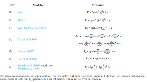 Para el volumen total se evaluaron dos modelos reportados en literatura especializada (Da Cunha & Guimaraes, 2009; Muñoz et al., 2012; Ramos-Uvilla et al., 2014). Por su parte, de los modelos de razón de volumen evaluados, tres fueron basados en la razón porcentual del diámetro (Rd ) y dos en la altura (Rh ); estos fueron estudiados para las especies de Fagus sylvatica, Eucalyptus grandis, E. nites y Pinus radiata (Trincado et al., 1997;Chauchard & Sbrancia, 2005; Gilabert & Paci, 2010; Barrios et al., 2014; Hernández-Ramos et al., 2017; tabla 2).