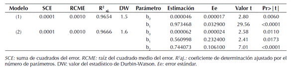 El ajuste estadístico de los modelos de Vt, de acuerdo con R2aj., indica que las variables independientes explican más del 96 % de la variabilidad de la variable dependiente, las valores en la SCE y la RCME son semejantes para ambos modelos y sus parámetros son significativos al 5 % de significancia (tabla 3).