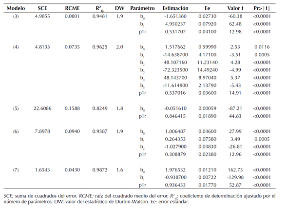 El ajuste de todos los modelos propuestos se realizó en el programa estadístico SAS 9.2 mediante el procedimiento de Proc Model que ajusta de igual forma modelos lineales y no lineales, y la técnica de máxima verosimilitud (Fiml, por sus siglas en inglés) (SAS Institute Inc., 2008). La selección de los mejores modelos se realizó de acuerdo a los menores valores en la suma de cuadrados del error (SCE) y en la raíz del cuadrado medio del error (RCME), el mayor valor en el coeficiente de determinación ajustado (R2aj. ) y la significancia de los parámetros (Da Cunha & Guimaraes, 2009).