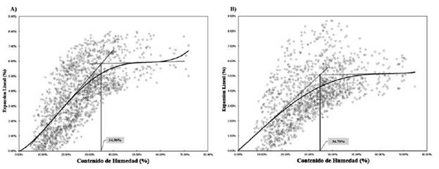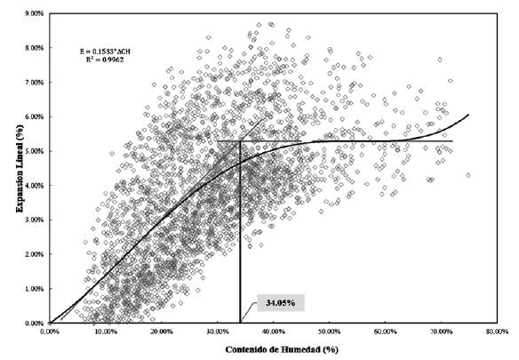 A partir de estos resultados se utilizó la parte lineal de la figura 2, con el fin de tener una ecuación que permita calcular la expansión lineal de la guadua, cuando el material sufre un aumento en el contenido de humedad, siempre y cuando el contenido de humedad se encuentre por debajo del PSF, en este caso, 34.05 %. Por lo tanto, la expansión lineal que puede sufrir un elemento de guadua rolliza en su dirección radial o tangencial se puede expresar como: