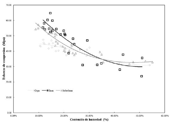 De acuerdo con lo que se observa en la figura 4, se evidencia que la basa y sobrebasa resisten mayores esfuerzos de compresión paralela en comparación con la cepa, la cual resiste un menor esfuerzo debido a que esta parte presenta una menor densidad de fibras (Liese, 1998), tal como lo han reportado diversos autores (Tan et al., 2011; Luna et al, 2012). Igualmente, se observa que en la cepa la pendiente de la figura esfuerzo último a compresión versus humedad es menos pronunciada en comparación con las zonas de basa y sobrebasa.