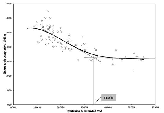 En la figura 4 se presenta la curva de esfuerzo a la compresión paralela en función del contenido de humedad para todas las partes de la guadua en altura. De esta gráfica se determinó que, de acuerdo con los ensayos de resistencia, el PSF de la G. angustifolia Kunth corresponde a 34.00 %, ya que a partir de ese CH presenta un cambio de la pendiente y la resistencia a la compresión se mantiene prácticamente constante.