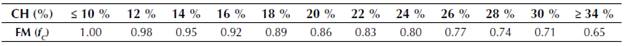 Con estos resultados también fue posible plantear los factores de modificación de la resistencia a la compresión en la G. angustifolia, al encontrar que la resistencia a la compresión paralela a la fibra varía significativamente para contenidos de humedad entre el 10 % y el 34 %, punto que se ha escogido como el PSF. En ese rango, la guadua puede disminuir su resistencia hasta en un 35 % tal y como se muestra en la figura 4. Utilizando la ecuación de la línea recta con los datos normalizados de la resistencia a la compresión entre 10 % y 34 % de CH, se puede plantear un factor de modificación de la resistencia como se muestra en la tabla 1.