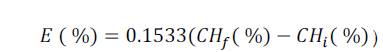 Donde E corresponde a la expansión lineal de la guadua en porcentaje, CHf es el contenido final de la guadua, CHi es el contenido inicial de la guadua antes del aumento en su humedad. Ambos contenidos deben expresarse en porcentaje para obtener la expansión lineal en porcentaje.