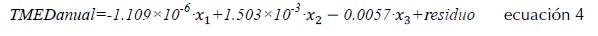 La regresión lineal múltiple obtenida para la temperatura media del aire TMEDanual se expresa en la ecuación 4: