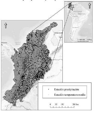 El área de estudio utilizada corresponde a los departamentos de las regiones Andina, Pacífica y Caribe de Colombia, con un área de 481 312 km2 (figura 1). Se utilizó el promedio multianual para el periodo 1980-2011 de 1440 estaciones con datos de lluvias y 258 estaciones con datos de temperatura media del aire. Estos promedios fueron construidos con las series históricas mensuales de las estaciones disponibles dentro del área de estudio que aprobaron controles de calidad, incluyeron filtros gruesos, coherencia estadística y espacial, además que hayan sido sometidas a la generación de datos faltantes mediante el método de las proporciones (Guijarro, 2014) y a pruebas de homogeneidad como el test SNHT (Standard Normal Homogeneity Test; Alexandersson, 1986) y el test de McCuen (McCuen, 1998).