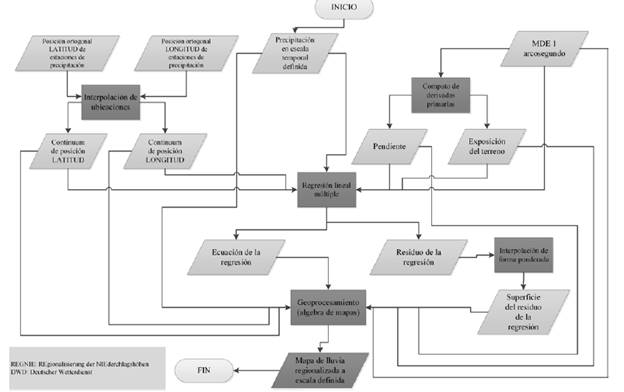 Se siguió el modelo Regnie descrito por Rauthe et al. (2013), que incluyó dos etapas: primero, el cálculo de las variables geográficas-fisiográficas y, segundo, el cálculo espacial de la precipitación y temperatura media del aire.