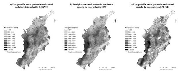 El coeficiente de determinación de la RLM de 0.2, entre las variables geográficas, fisiográficas y la precipitación, es un indicador de baja relación lineal entre estas variables y la lluvia a escala anual. A pesar de esto, la calidad de la predicción arrojó estadísticos de prueba de la superficie derivada del modelo aceptables (R2 = 0.81, EM = 55.63, EMA = 336.53 y RMSE = 0.50), contrastando datos estimados y datos de puntos de validación elegidos aleatoriamente. Además, se reconocen detalles no percibidos en las superficies generadas por IDW o Spline, especialmente en las zonas de alta montaña (v. gr. valles interandinos y el complejo montañoso aislado del norte de Colombia que corresponde a la sierra Nevada de Santa Marta). De lo anterior se puede afirmar que, tras la incorporación de aspectos fisiográficos, la interpolación mejoró su detalle espacial, debido a que el cálculo de la RLM se realizó independiente en cada pixel del MDE de entrada (30 x 30 metros) y luego fue re-escalado a una resolución de pixel de 1000 x 1000 metros, inferior a la distancia real entre estaciones, que se utiliza como referencia para definir la resolución o detalle espacial en los modelos IDW y Spline.