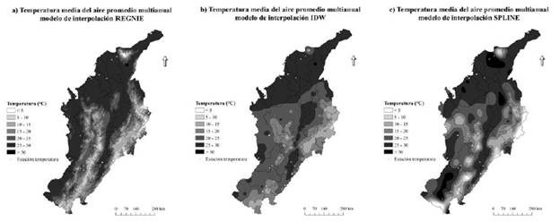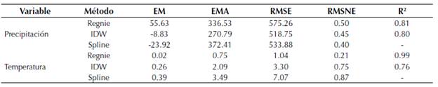 Los estadísticos de prueba de la temperatura media del aire mostraron que el método Regnie presentó mejores resultados que los otros dos métodos implementados, resultado acorde con Bustamante (2003), quien afirmó que un modelo relativamente simple de interpolación lineal de la elevación, latitud y longitud produce resultados bastante satisfactorios para la interpolación de la temperatura (entre 80-90 % de la varianza explicada). La RLM mostró un alto coeficiente de determinación (0.94), lo que confirma la relación inversa entre la temperatura y la altitud explicada por el gradiente adiabático (Jones, 1996, citado por Hartkamp et al., 1999; Cuadrat & Vicente, 2008).