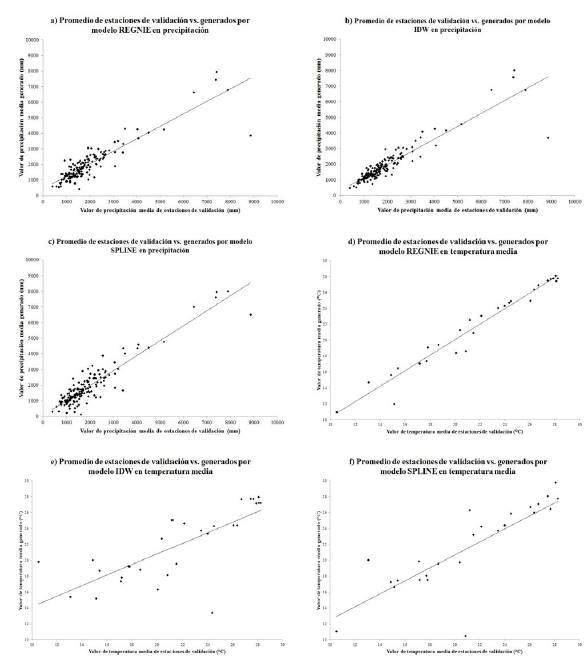Comparaciones entre los datos de las estaciones de prueba y los modelos de interpolación se muestran en los diagramas de dispersión para la precipitación (figura 5a, figura 5b y figura 5c) y la temperatura media del aire (figura 5d, figura 5e y figura 5f).