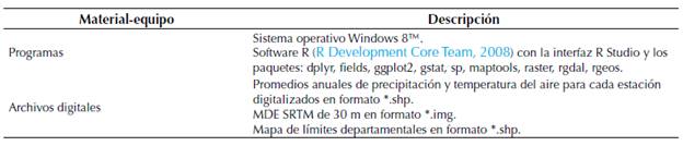 Se procedió a obtener la superficie de precipitación mediante la multiplicación de los coeficientes de la RLM con las cinco variables geográficas-fisiográficas en formato ráster y adicionando el residuo, tal como lo expresa la ecuación 1. Para este proceso se desarrolló un script en lenguaje R (anexo 1), que utiliza los paquetes mencionados en la tabla 1. Se repitió el proceso para la temperatura media del aire incorporando los coeficientes de regresión, las variables del terreno mencionadas y el residuo respectivo.