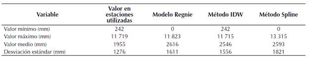 El modelo Regnie mostró el mejor desempeño para la interpolación de la precipitación según los estadísticos RMSE y RMSNE, mientras el IDW fue mejor según el EM y EMA. Los peores estadísticos de prueba los mostró el modelo Spline, excepto en el coeficiente de determinación R2, que por ser mayor que 1 no fue posible su comparación con los demás modelos. Como se observó con los estadísticos de tendencia central, y de acuerdo con lo reportado por Olaya (2011), Spline crea superficies espaciales que pueden alcanzar valores fuera del rango definido por los puntos de entrada, presentándose oscilaciones artificiales significativas.