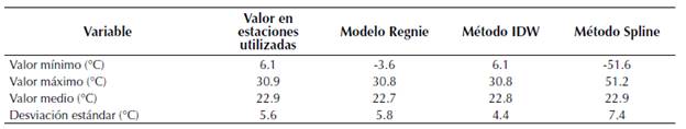 El modelo de temperatura media obtuvo un coeficiente de determinación de 0.94 y un valor F de 1192, lo que señala que el resultado de la regresión tampoco fue aleatorio, dado que el valor crítico según la tabla de distribución F de Fisher al 95 % de probabilidad con g.l. v1 = 3 y g.l v2 = 254 es de 2.64. Por lo tanto, es extremadamente improbable que un valor F tan elevado se produjera por azar. El valor medio de los datos utilizados para la temperatura fue cercano al calculado con los modelos de interpolación; mientras la desviación estándar fue similar en solo el modelo Regnie, mientras fue menor y mayor en los modelos IDW y Spline, respectivamente (tabla 3).