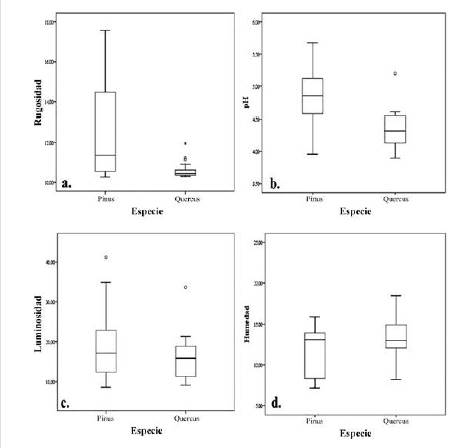 Respecto a la rugosidad, se encontró una mayor heterogeneidad en los registros obtenidos sobre las cortezas de P.patula comparado con Q. humboldtii (figura 1a) y se observan diferencias significativas entre los forófitos (Kruskal-Wallis, p= 0.006) que indican que los pinos (promedio = 12.58) eran más rugosos que los robles (promedio = 10.60). En lo concerniente al pH, los robles se consideraron significativamente más ácidos que los pinos (Kruskal-Wallis, p < 0.05). Aunque la luminosidad fue más heterogénea en pinos que en robles (figura 2c), no presentó diferencias significativas (Kruskal-Wallis, p= 0.279). Por su parte, la humedad tampoco registró diferencias significativas entre las especies forófitas (Kruskal-Wallis, p= 0.279).
