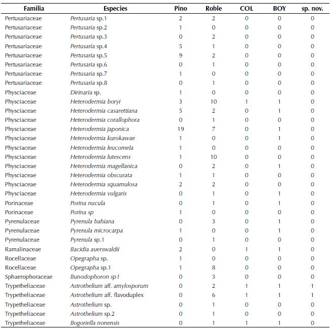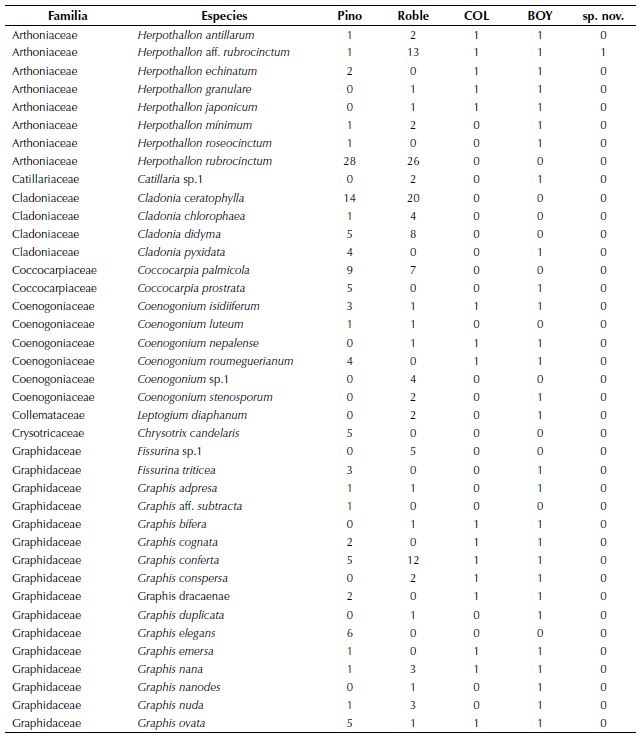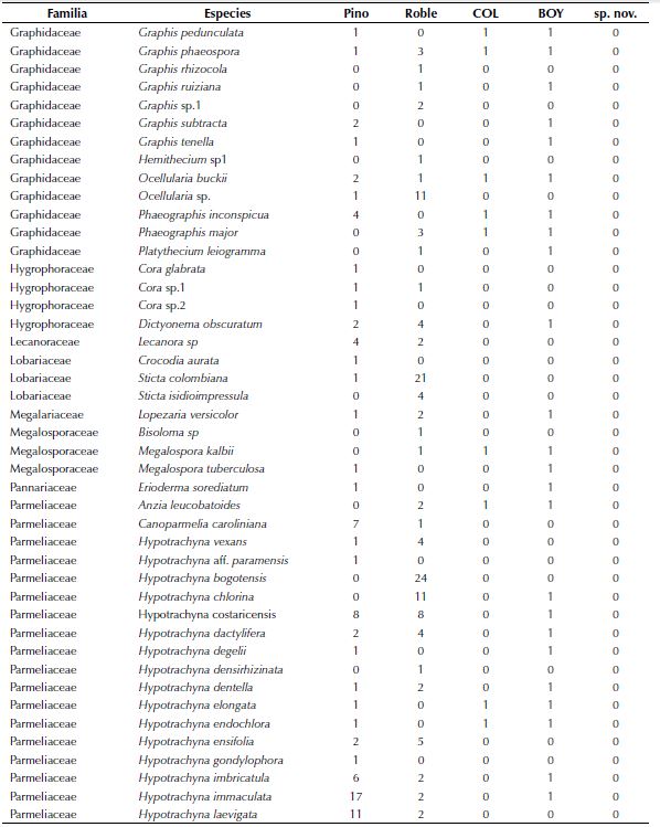 En los robles, Herpothallonrubrocinctum, Hypotrachyna bogotensis (Vain.) Hale y Cladoniaceratophylla (Sw.) Spreng fueron las especies más frecuentes (anexo 1) y se reconocen 47 especies únicas de este forófito, como son Heterodermiacorallophora (Taylor) Skorepa, Hypotrachynadensirhizinata (Kurok.) Hale y varias especies de Astrothelium, que también se destacaron por ser especies raras con un solo registro.