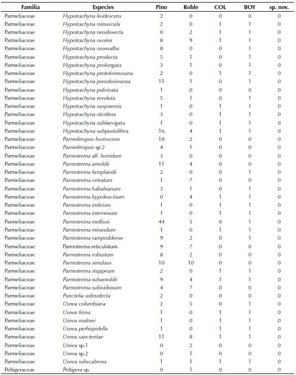 En el caso de los pinos, Parmotrema mellissii (C.W. Dodge), Herpothallon rubrocinctum (Ehrenb.) Aptroot, Lücking & G. Thor y Heterodermia japónica (M. Satô) Swinscow y Krog fueron las especies más frecuentes (anexo 1). En contraste, Crocodiaaurata (Ach.) Link, Erioderma sorediatum Galloway y Jørg y Parmotremaindicum Hale, entre otras, presentan un solo registro y hacen parte de las 50 especies únicas del pino.
