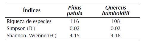 Los arboles de Pinuspatula (pino), con 116 especies, exhibieron una mayor riqueza liquénica que la observada en Quercus humboldtii (roble), con 108 especies (tabla 1). Para las dos especies forófitas se observan bajos valores de dominancia (Simpson; D’= 0.02) y valores similares en la equidad con H’= 4.15 para P. patula y H’= 4.18 para Q. humboldtii. Se observa una composición liqúenica que difirió sustancialmente entre las dos especies forófitas con un índice de Jaccard (IJ = 0.38) que señala que se comparten el 38% de las especies.