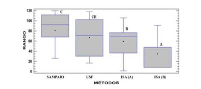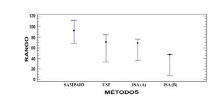 El test de rangos múltiples de Duncan identificó tres grupos homogéneos para los cuatro métodos (figura 3). El método ISA(B) conforma el grupo A, que presentó las evaluaciones de riesgo más bajos en el ranking; los métodos ISA(A) y USF conforman el grupo B, con valores de riesgo en rangos intermedios, relación que también pudo observarse en la comparación del estudio hecho por Norris (2007) ; mientras que USF y método Sampaio constituyen el grupo C, con los valores de riesgo más altos. Estos resultados se observan con mayor claridad en el gráfico de medianas con intervalos, con 95% de confianza (figura 2). En esta figura se aprecia que la mediana del método Sampaio presentó un valor centrado en el rango, para el caso de los métodos USF e ISA(A) se ubicó en valores más altos y para el método ISA(B) se posicionó en el extremo de los valores altos dentro del ranking.