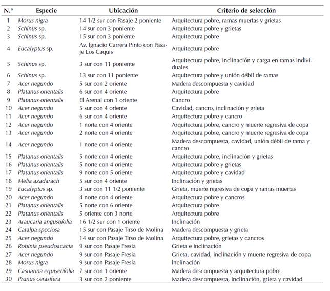 Se seleccionaron visualmente 30 árboles en sectores residenciales y comerciales de la ciudad, los cuales aparentemente mostraban diferentes condiciones de riesgo. Los criterios de selección se basaron en parámetros e indicadores de riesgo considerados en los métodos de evaluación elegidos que se encuentran definidos en la tabla 1.