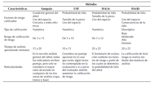 C) A Photographic Guide to the Evaluation of Hazard Trees in Urban Areas (Matheny y Clark, 1994; Método ISA[A]), desarrollado bajo la International Society of Arboriculture y ampliamente utilizado y modificado por municipios y arboristas comerciales (Koeser, Hasing, McLean y Northrop, s.f.; Calaza e Iglesias, 2016). Tiene un procedimiento cuyo protocolo de análisis está dividido en cinco secciones: características del árbol, estado fitosanitario, condición de sitio, blanco y defectos del árbol. En cada una de estas secciones se determina la gravedad de los defectos individuales y se identifica la o las partes del árbol con mayor probabilidad de fallo. La información recopilada permite calificar el riesgo del árbol mediante tres índices de puntuación: potencial falla (1-3 puntos), tamaño de la parte (1-4 puntos), puntaje de uso (1-4 puntos). Los puntajes alcanzados en cada sección se suman para obtener el índice final de riesgo, siendo 12 el máximo valor. Las puntuaciones tienen solo un significado relativo, un árbol puntuado con 11 tiene un mayor riesgo potencial que uno con 5, por lo que un árbol puntuado con 12 significa un peligro extremo, aunque la eliminación de este peligro puede ser tan simple como mover el blanco bajo riesgo (Calaza e Iglesias, 2016).