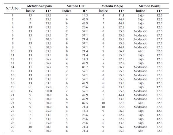 Se obtuvo los índices de riesgo para cada árbol evaluado y su índice estandarizado para cada uno de los métodos (tabla 3).