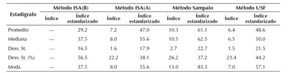 Los resultados evidenciaron diferencias estadísticas significativas en los métodos evaluados, conformando tres grupos homogéneos. El método Sampaio conformó un grupo, obteniendo índices de riesgo más altos, mientras un segundo grupo lo conformaron los métodos USF e ISA(A), con índices de riesgo medios a altos, y el tercer grupo fue constituido por el método ISA(B) que obtuvo valores bajos en la calificación de riesgo.